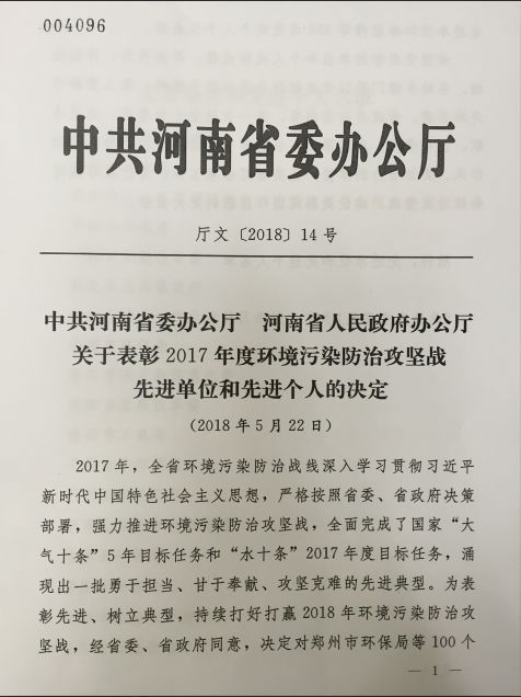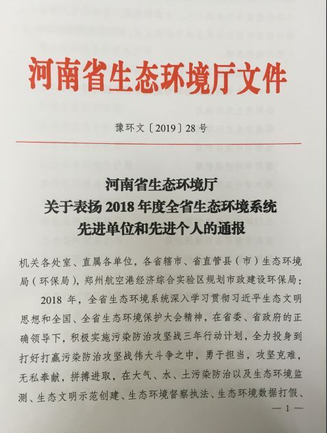 2018年被河南省委、省政府聯(lián)合表彰為全省環(huán)境污染防治攻堅(jiān)戰(zhàn)先進(jìn)單位,5人被表彰為先進(jìn)個(gè)人。