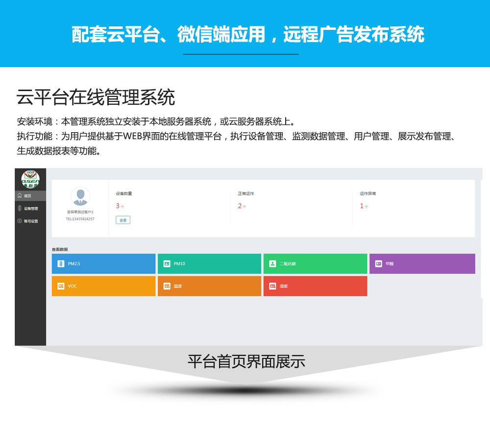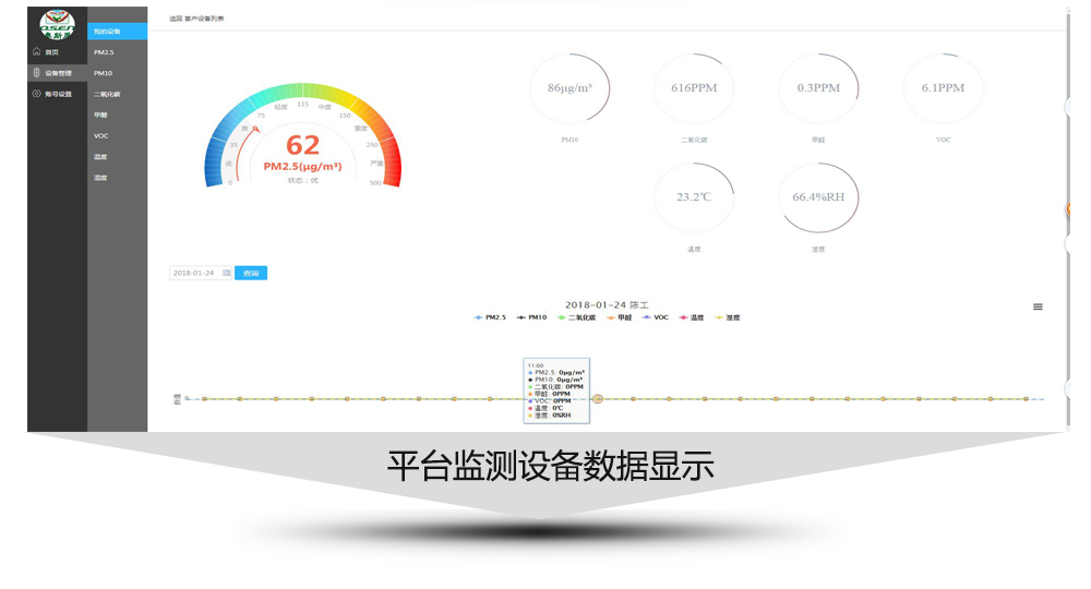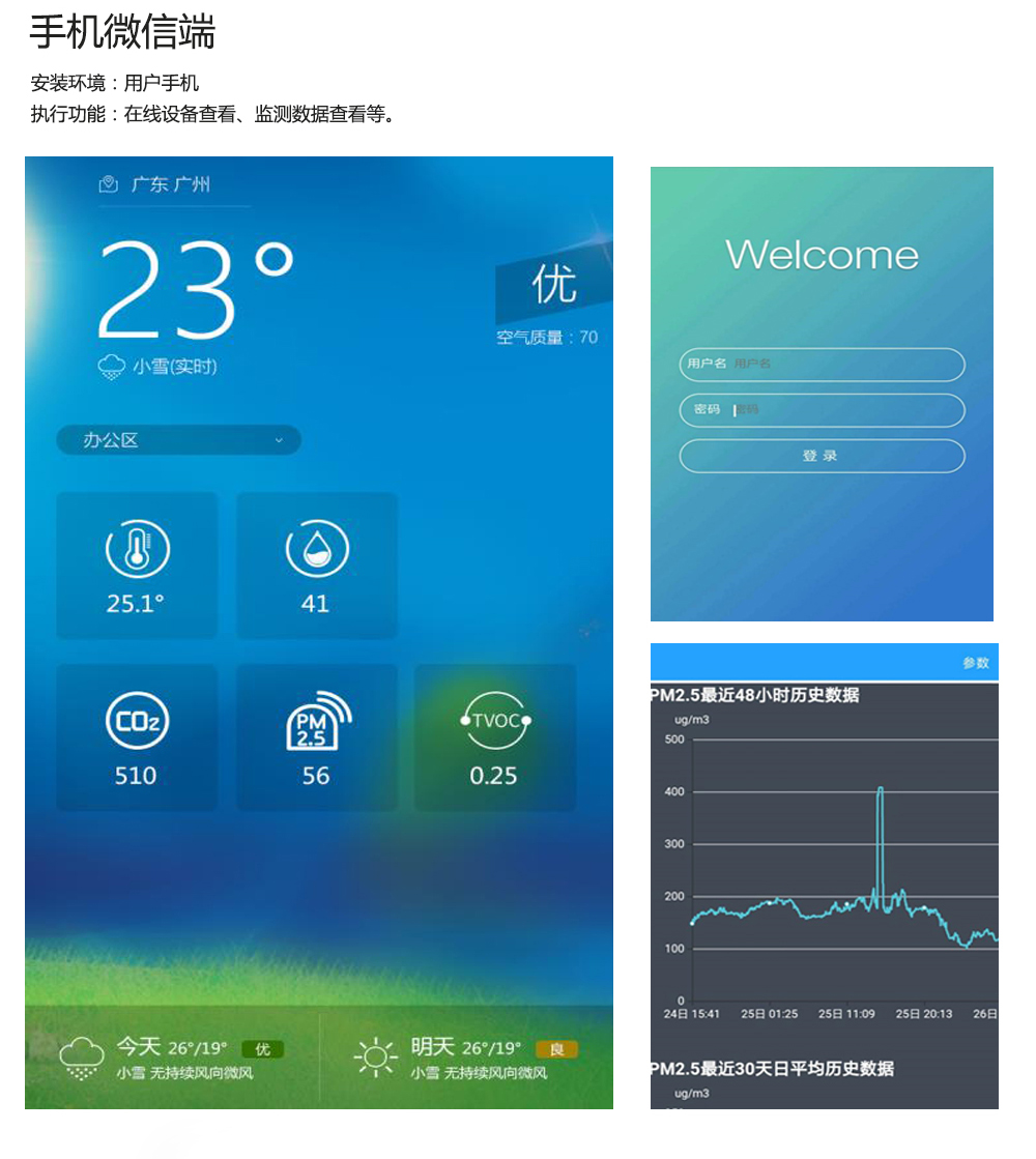 室內專用環境檢 監測系統終端是一款專門針對家居及公共場所室內環境而定制全面24小時實時在線監測的系統,可以在手機端、電腦端遠程查看相關監測數據。