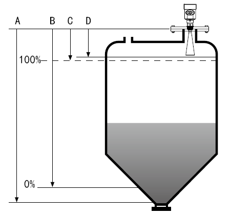 注:使用雷達(dá)物位計(jì)時(shí),務(wù)必保證最高料位不能進(jìn)入測(cè)量盲區(qū)(圖中D所示區(qū)域)。