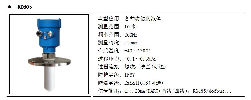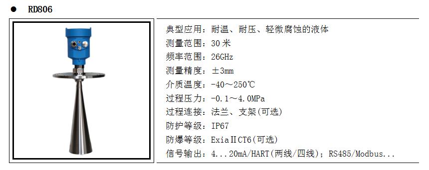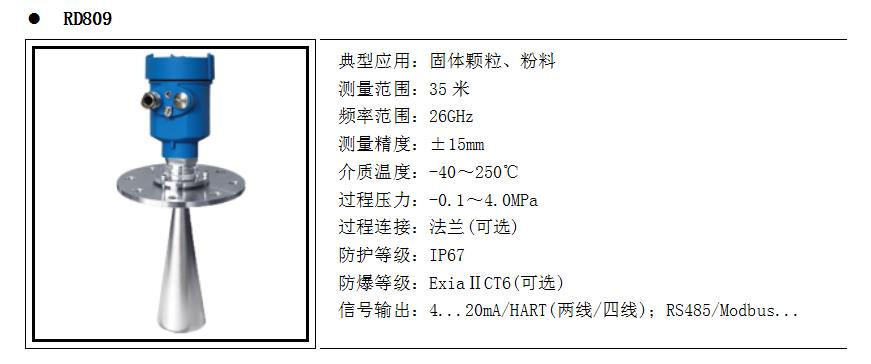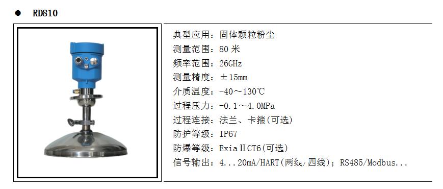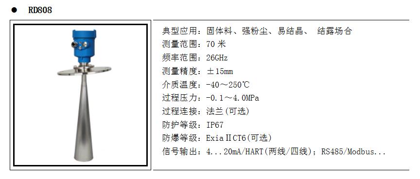 RD80X系列傳感器是26G高頻雷達(dá)式物位測(cè)量?jī)x表,測(cè)量最大距離可達(dá)80米。天線被進(jìn)一步優(yōu)化處理,新型快速的微處理器可以進(jìn)行更高速率的信號(hào)分析處理,使儀表可以用于反應(yīng)釜、固體料倉(cāng)等一些復(fù)雜的測(cè)量條件。