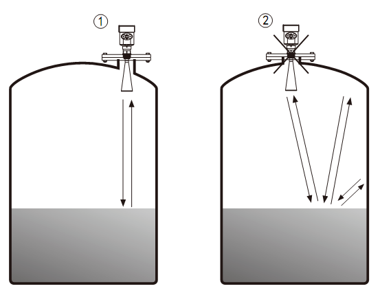 Ø 儀表不能安裝在拱形或圓形罐頂中間。除了會(huì)產(chǎn)生間接回波還會(huì)受到多次回波的影響。多次回波可能比真正回波的信號(hào)閥值還大,因?yàn)橥ㄟ^(guò)頂部可集中多個(gè)回波。所以不能安裝在中心位置。